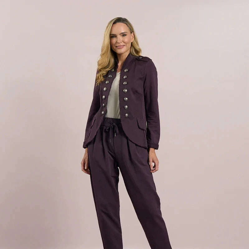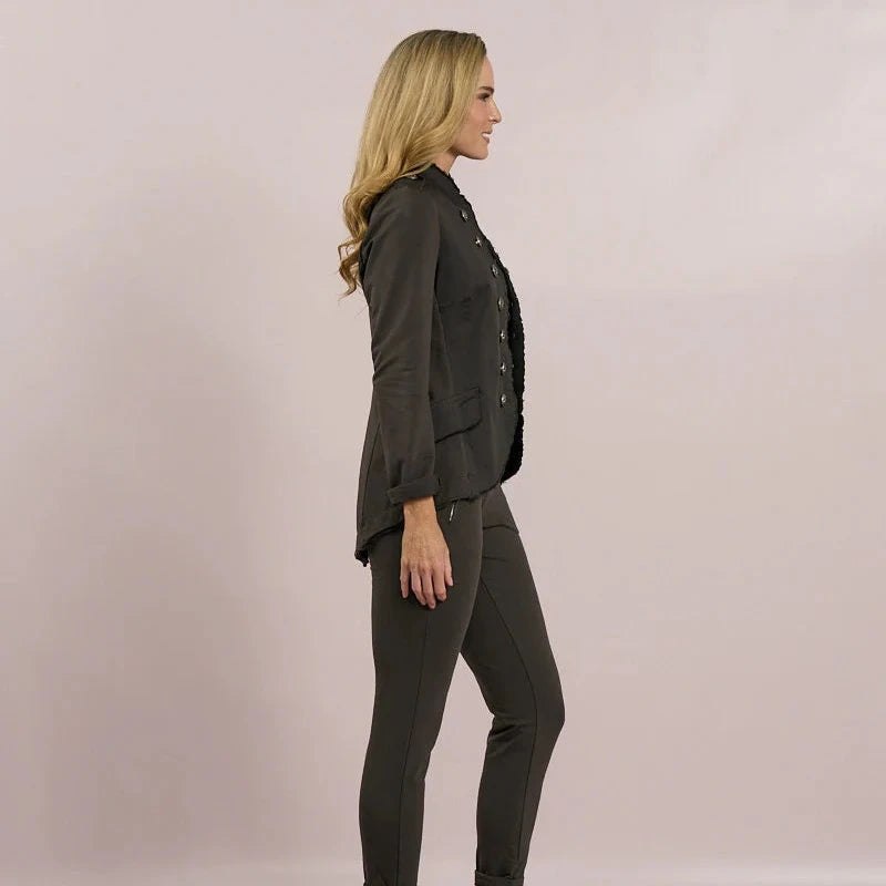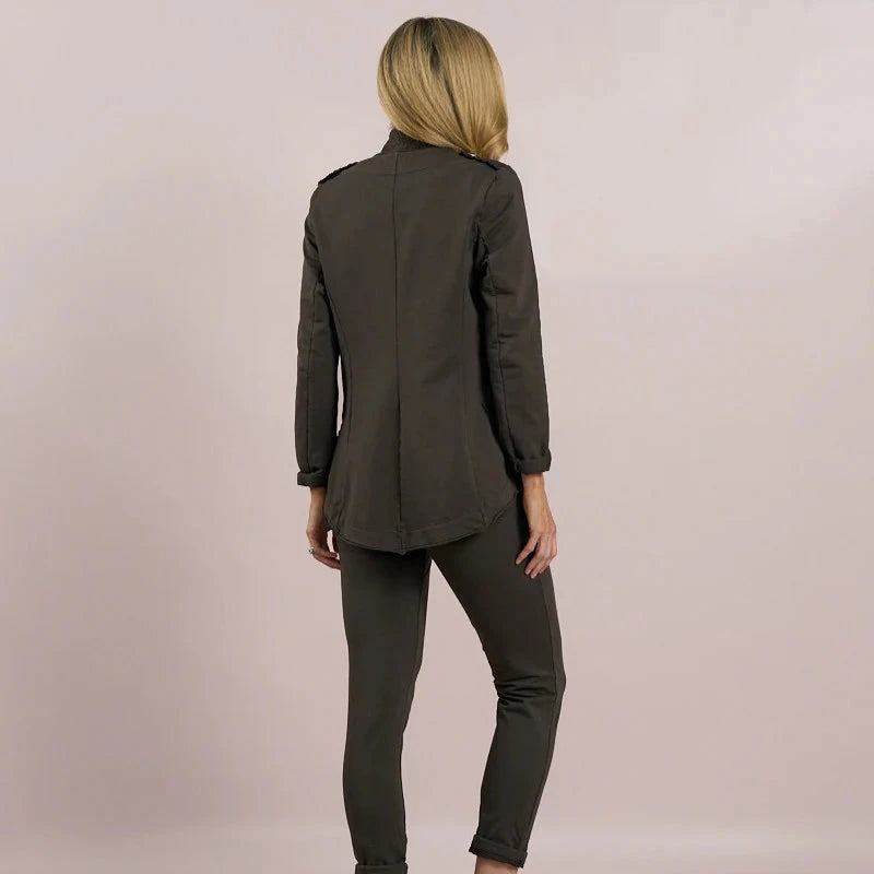 A lightweight military style jacket with an edge to edge fit, collarless neckline and studded button detail. A very on trend, easy to wear summer jacket, the perfect layering piece.