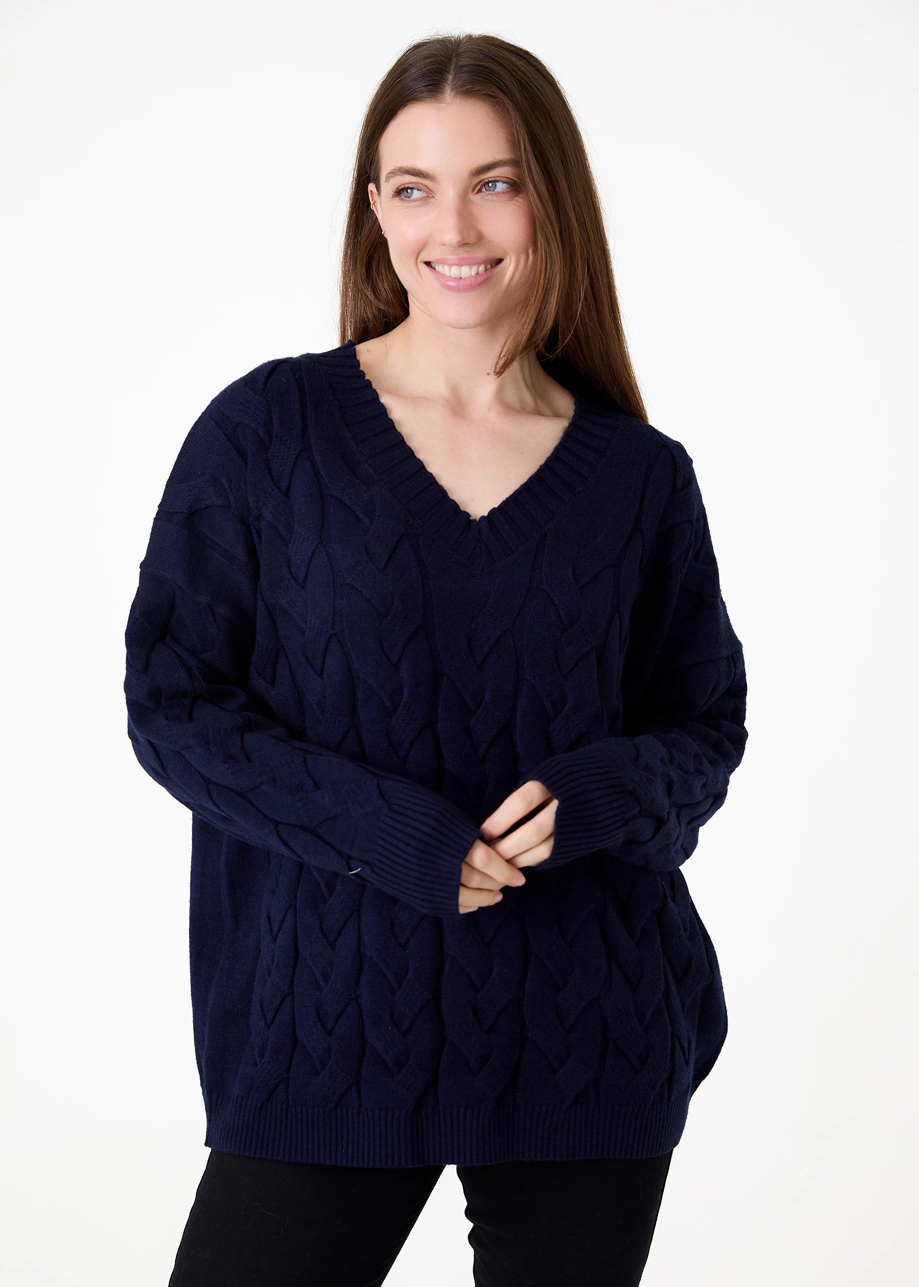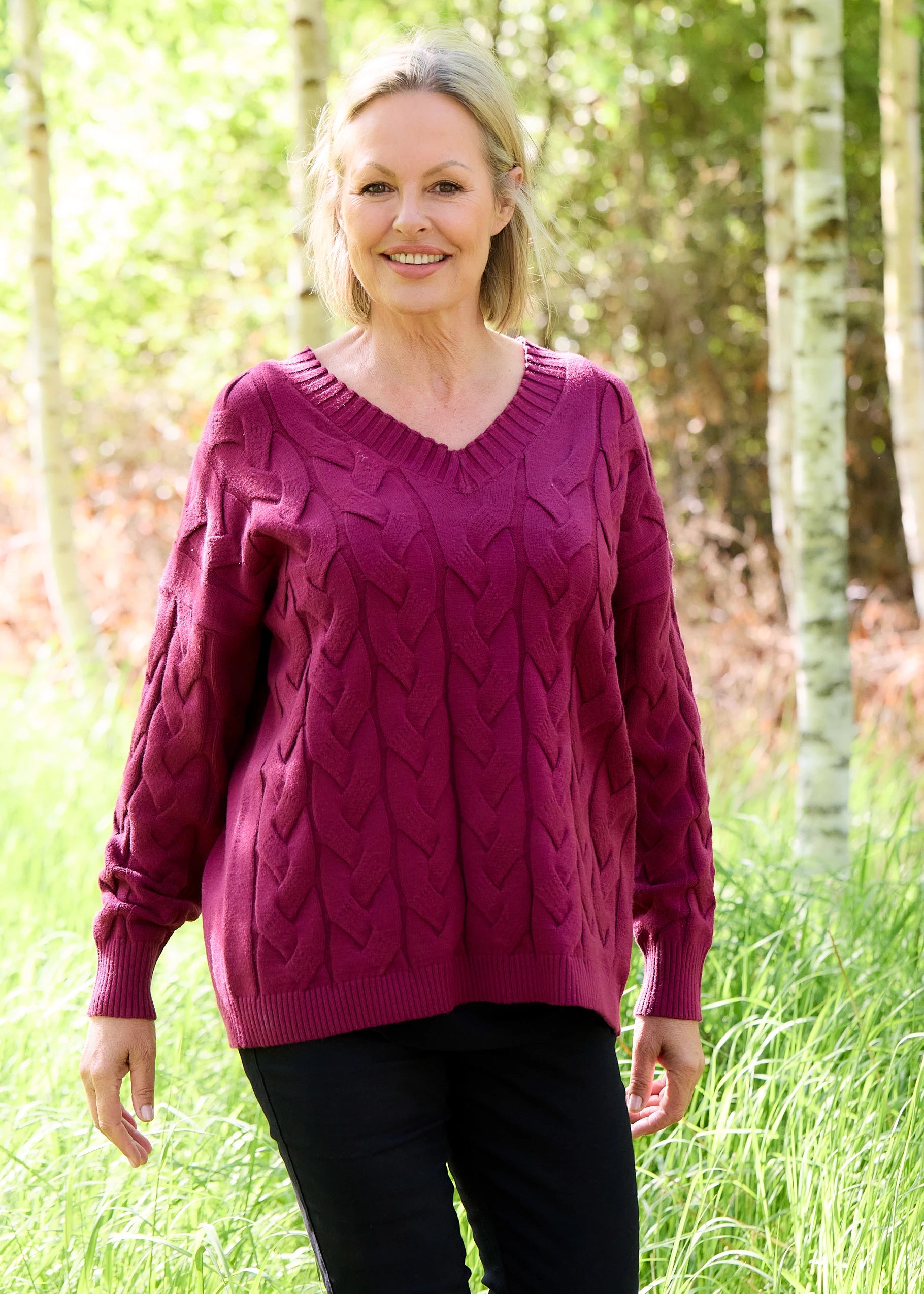 Our v neck cable jumper is a classic piece featuring a flattering v neckline and long sleeves. The intricate cable knit design adds texture and interest, making it a versatile wardrobe essential. Pair with your favourite jeans and heeled boots for an effortlessly chic look that will keep you warm and stylish all season long.