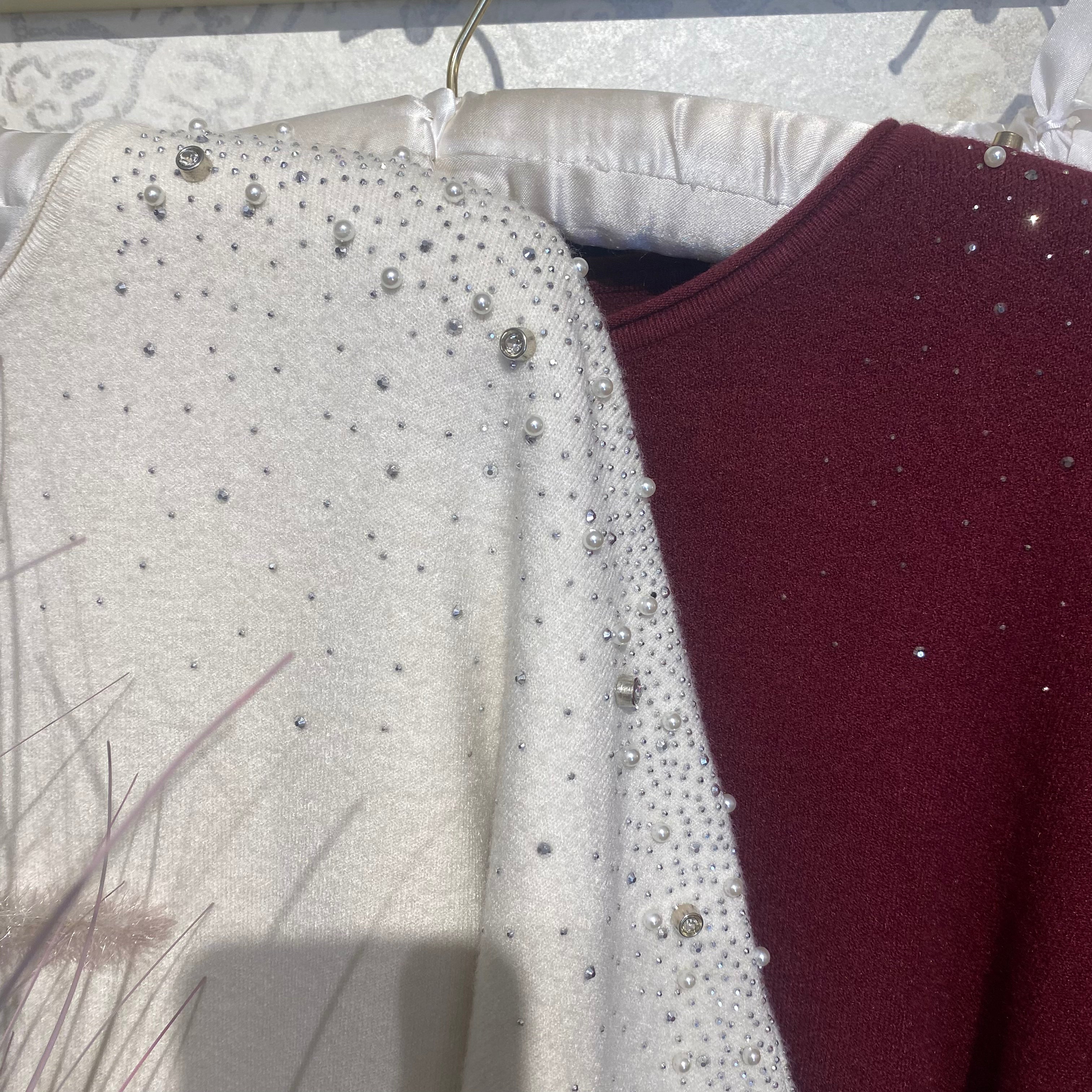 A beautifully soft woven knit with a box fit shape, round neck and mid length sleeves with a button detail. Finished with a pretty pearl stud & diamanté sparkle embellishment across the sleeves.