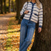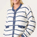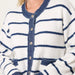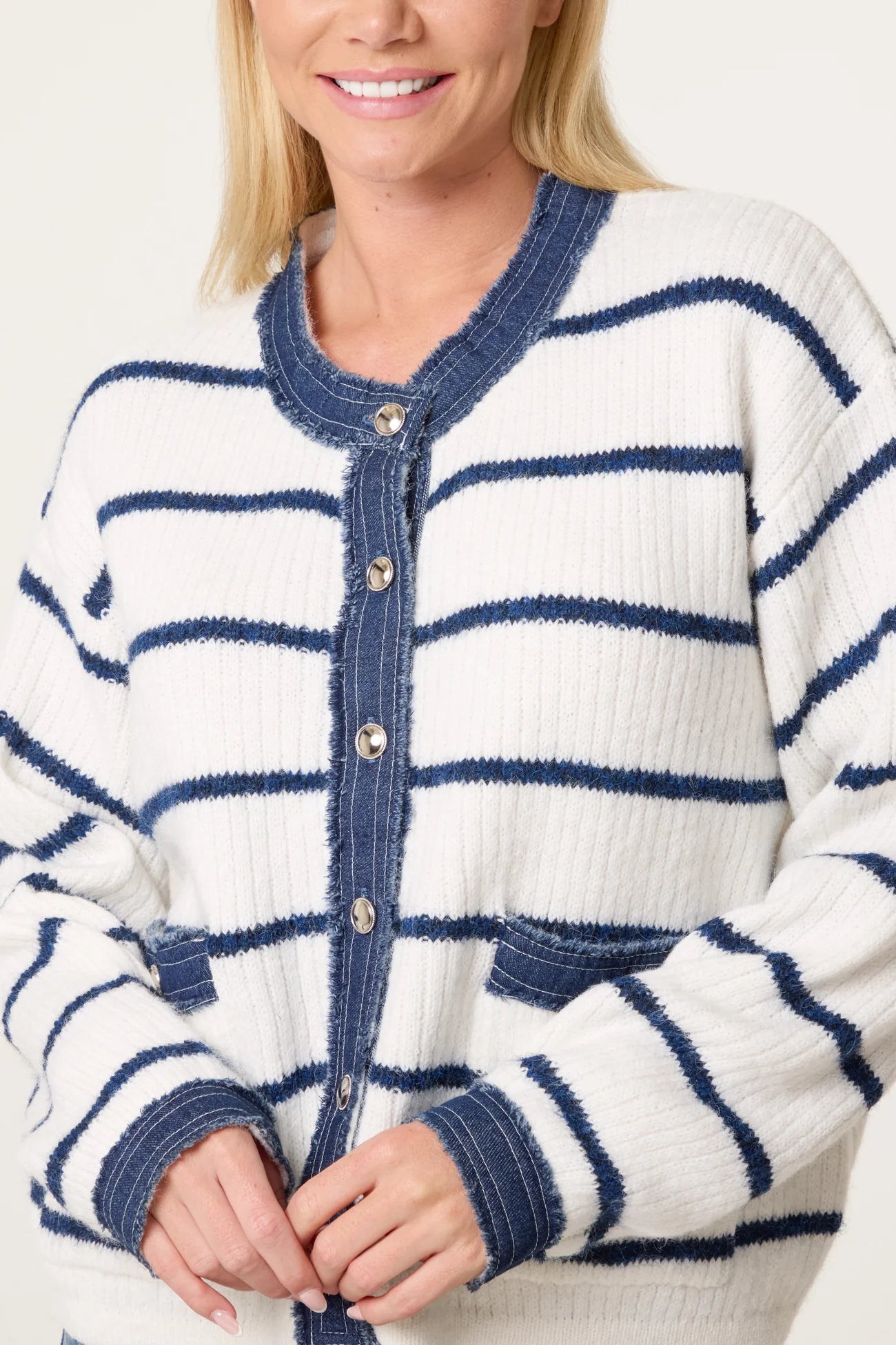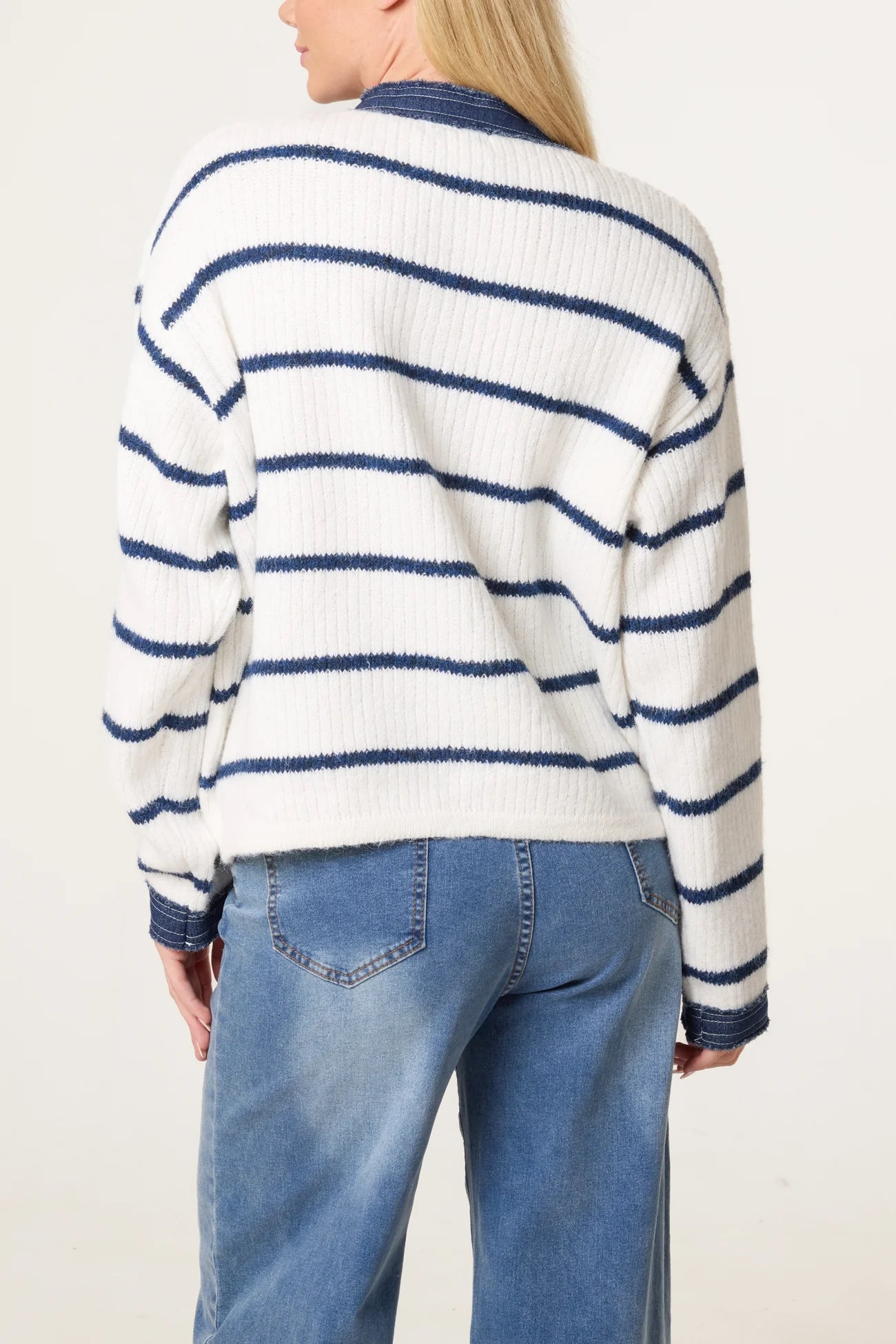 A soft knitted navy & white cardigan with a blue denim trim detail and silver stud buttons.