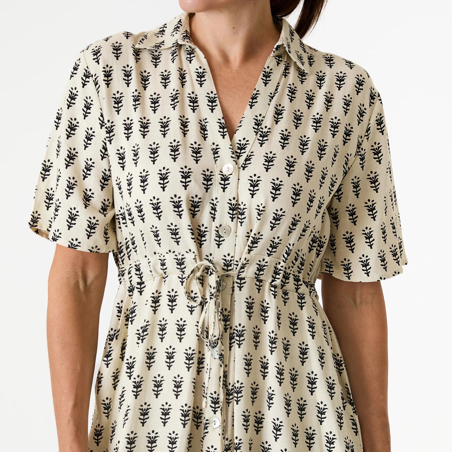 A block print linen dress with short sleeves, midi length & a drawstring waist.