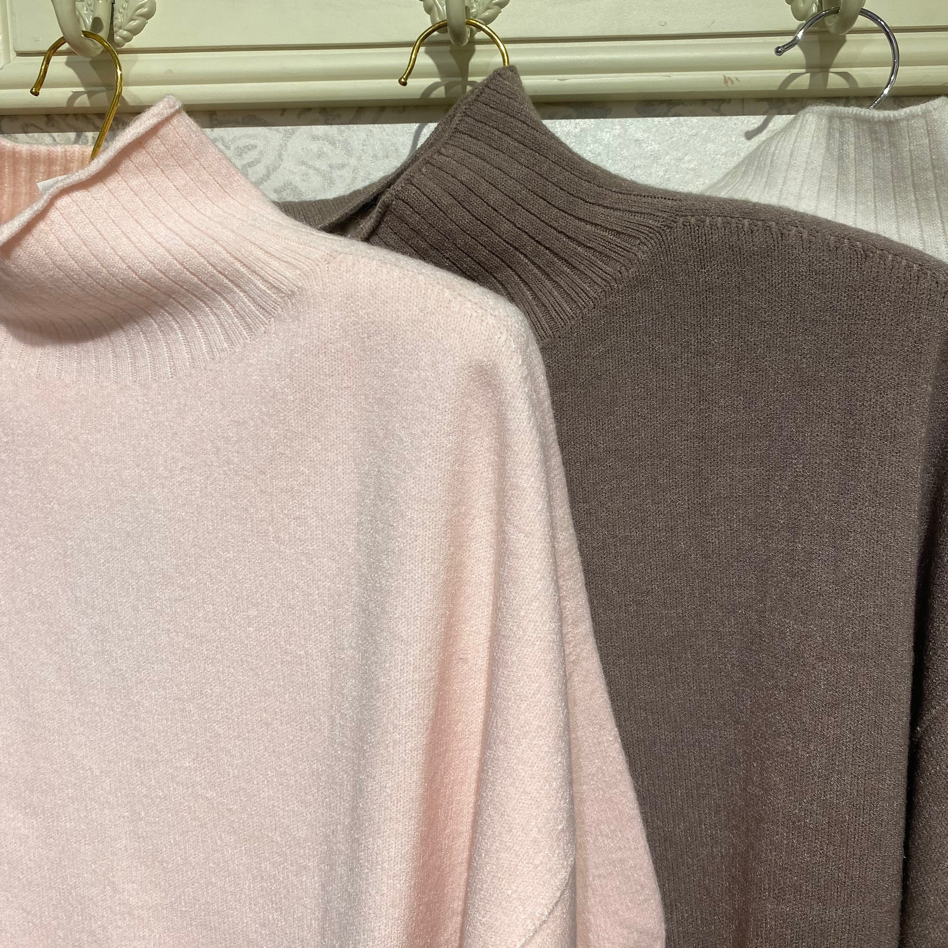 A soft woven knit with a funnel polo neck and short sleeves. The loose shape is super flattering and easy to wear with either skirts or wide leg trousers.