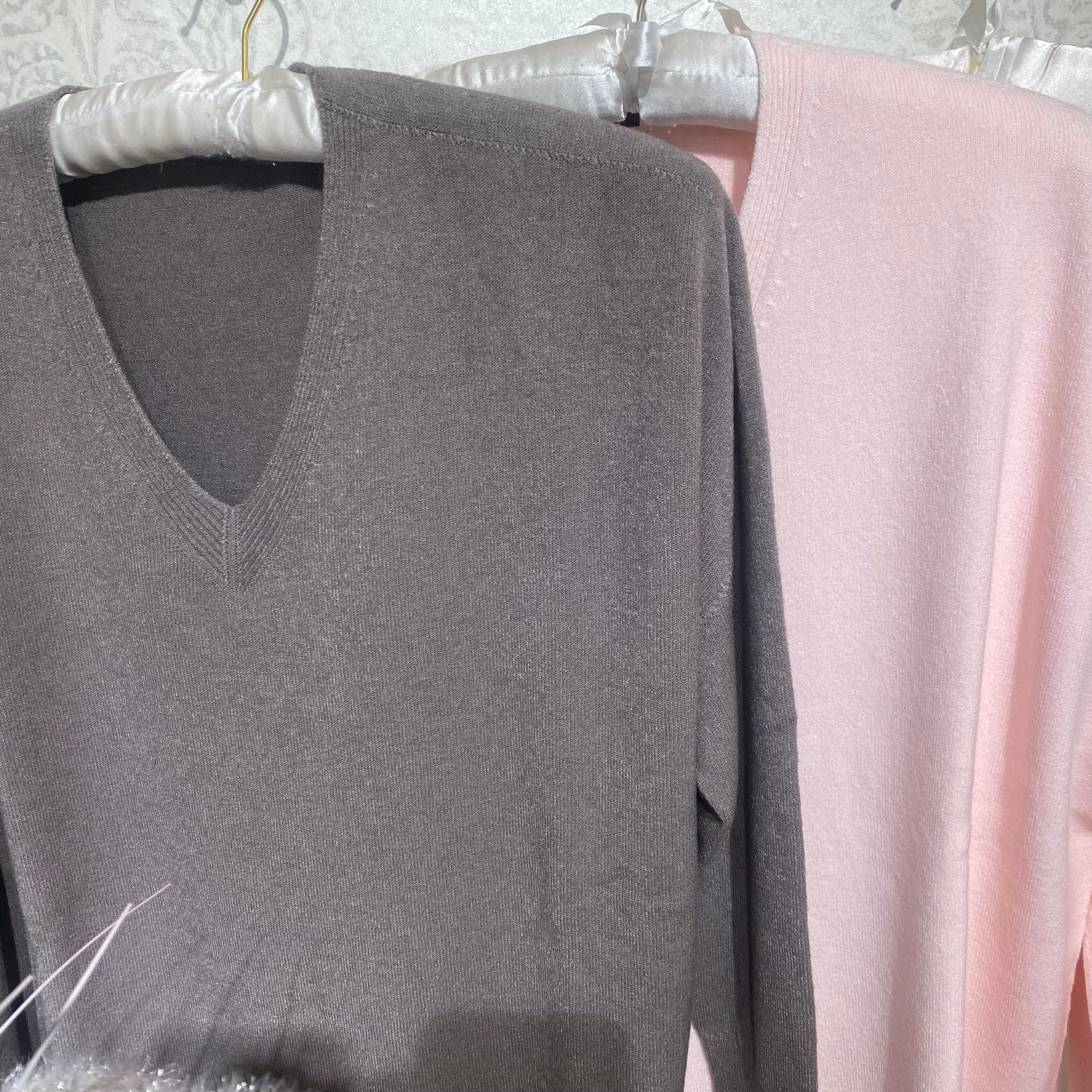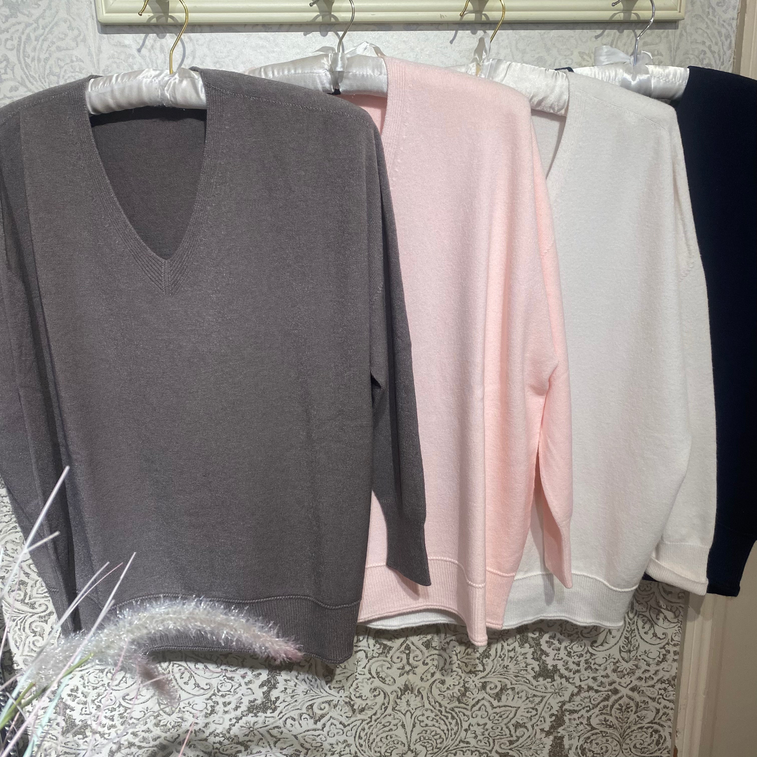 A soft knitted, long sleeve knit with a deep V neckline, lone sleeves and ribbed hem detail.