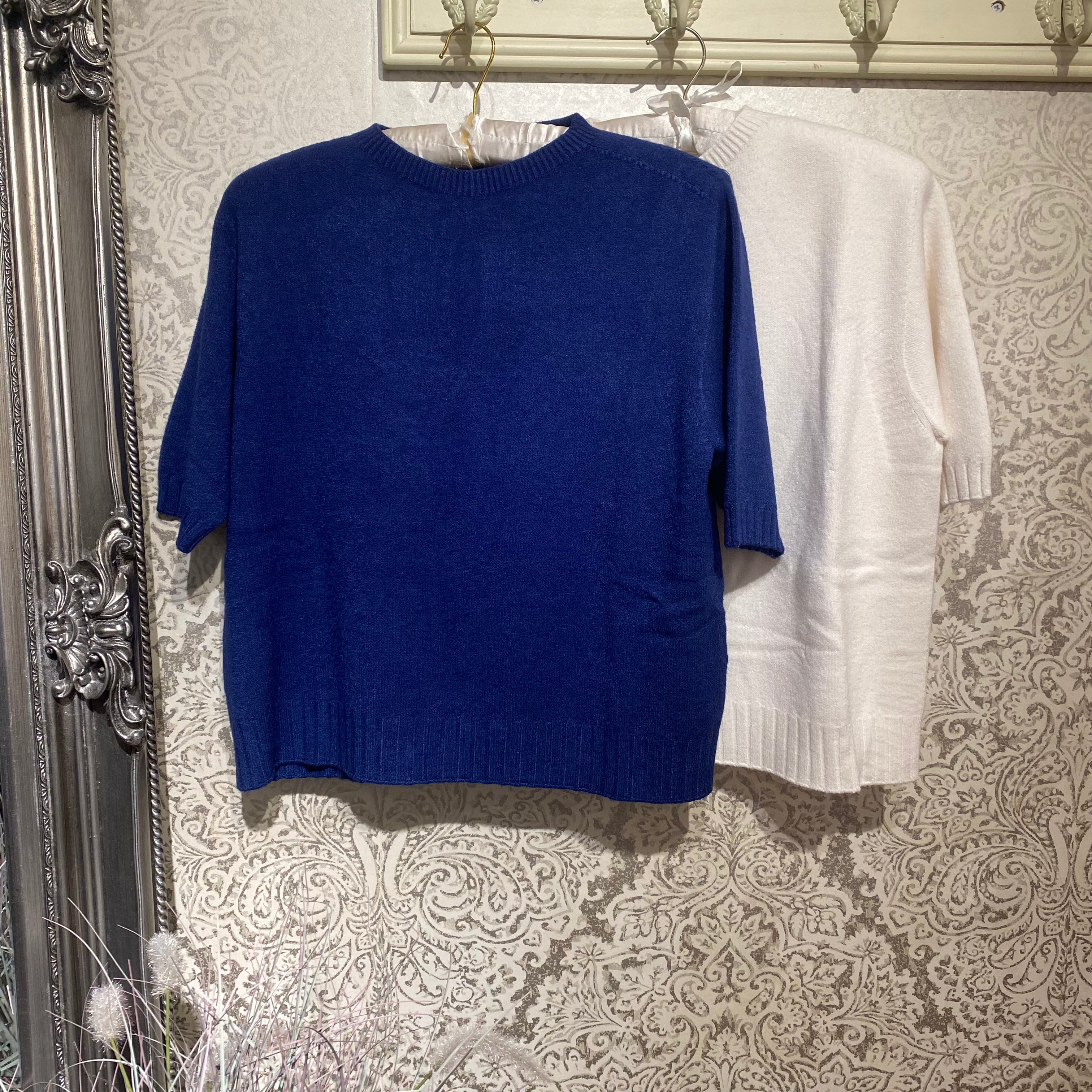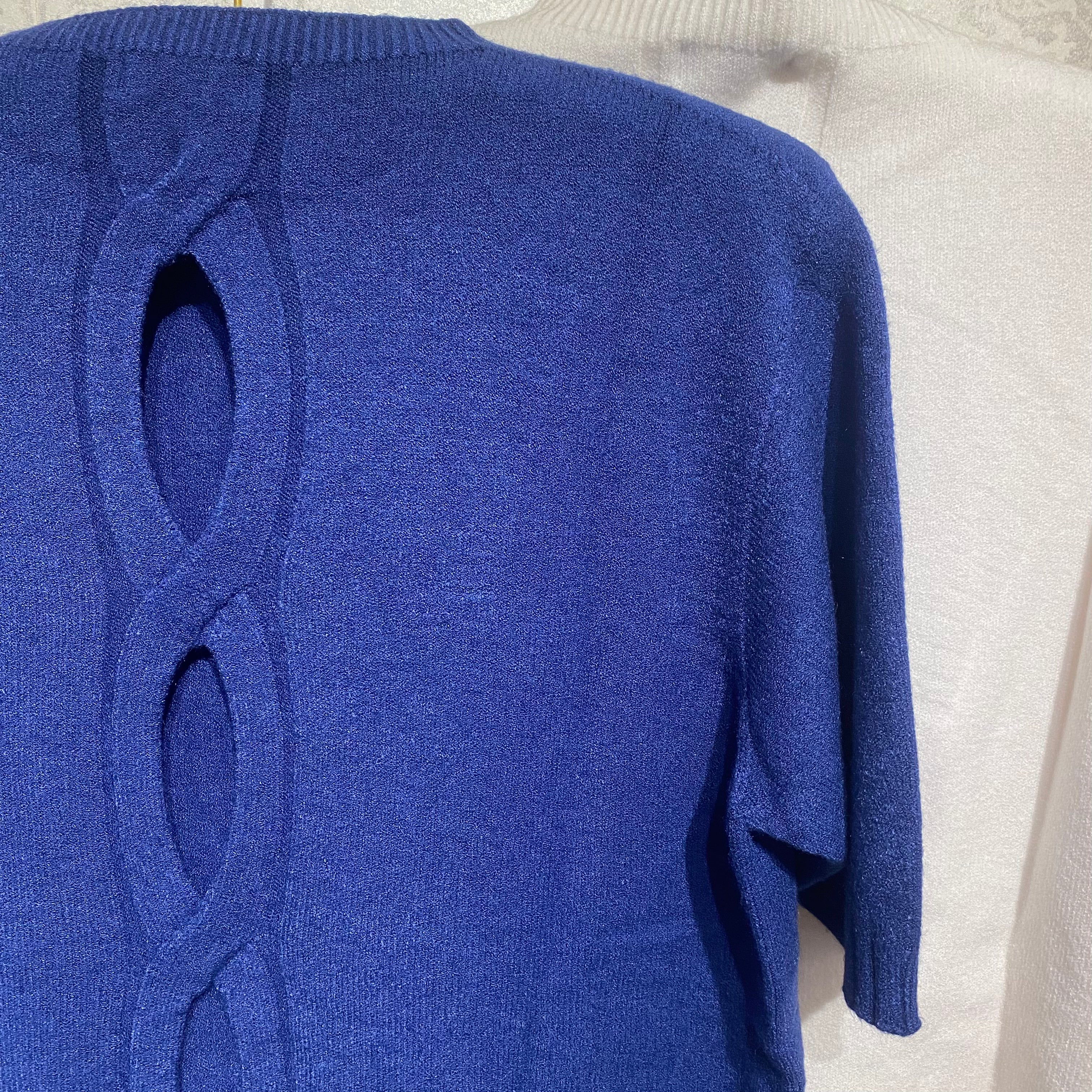 A soft woven knit with a round neckline, short sleeves and open cable back detail. The shorter, loose shape is super flattering and easy to wear with either skirts or wide leg trousers.