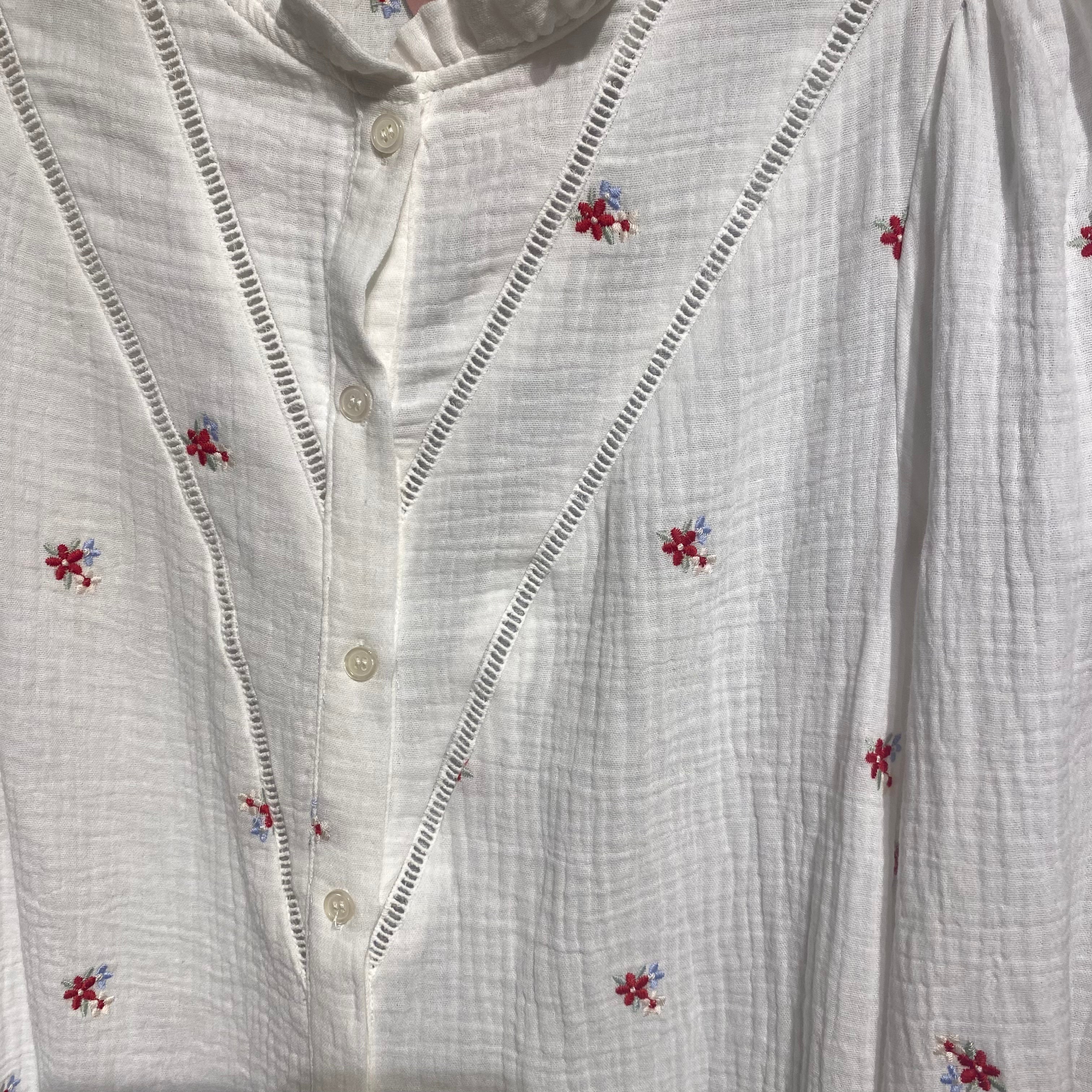A gorgeous cheesecloth cotton blouse with a frill trim and pretty embroidered flower detail.