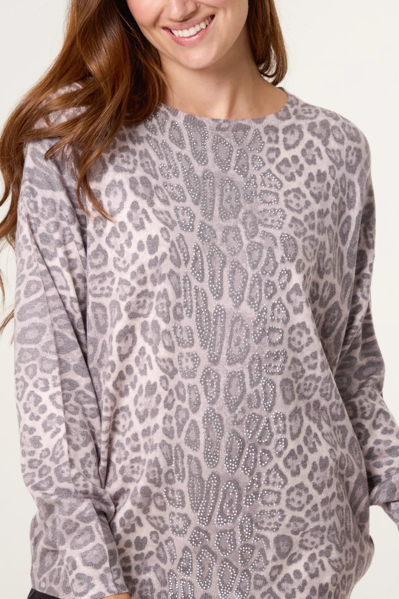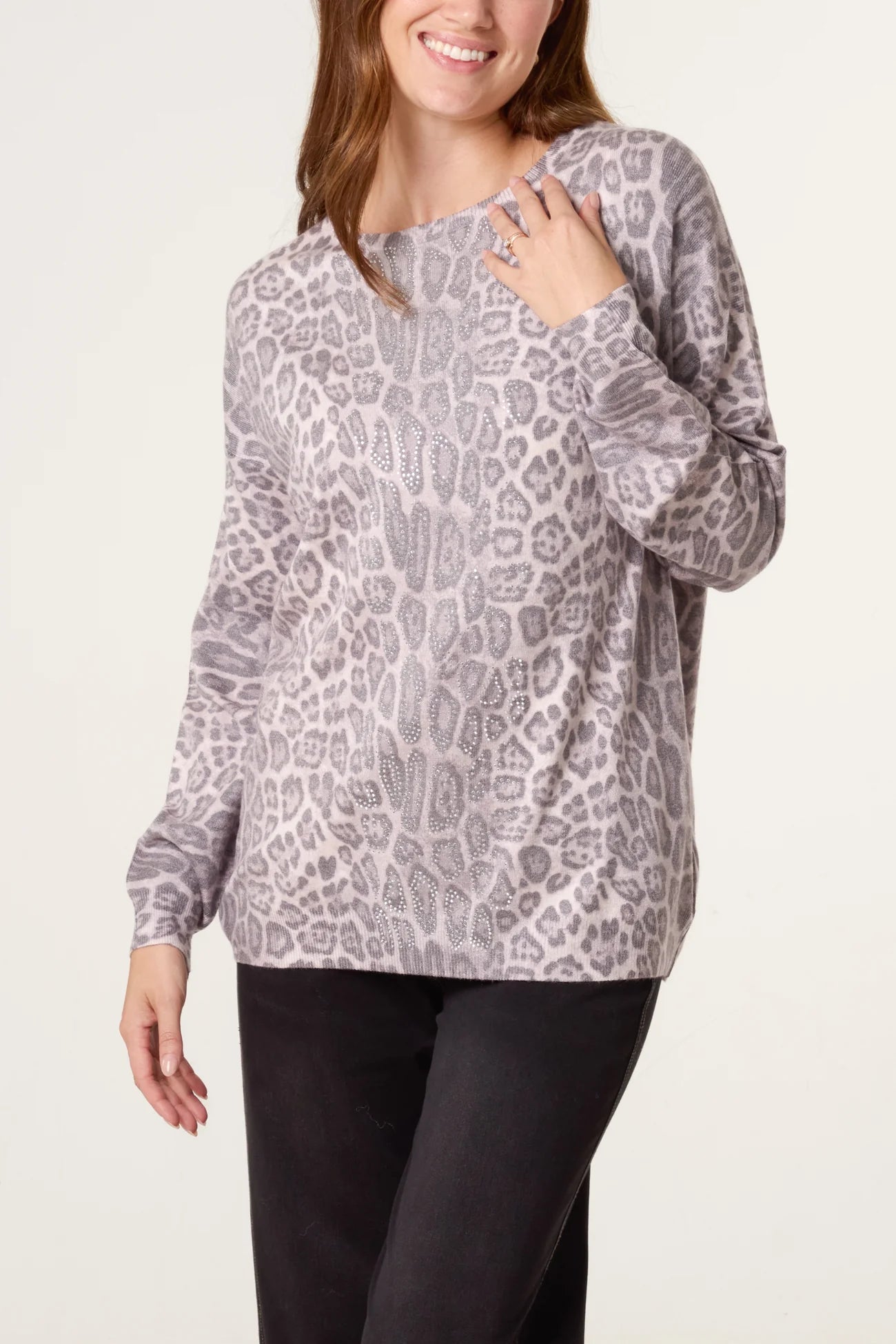 A fine leopard print jumper with a super soft feel, round neckline, long sleeves with a diamante sparkle embellishment.